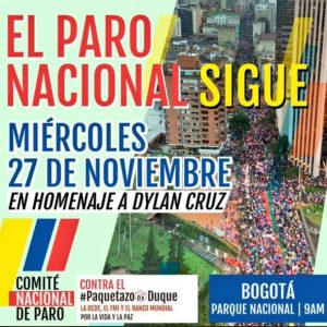 El Comité Nacional del Paro convocó para este miércoles 27 de noviembre la segunda movilización en todo el país, con el propósito de rendirle un homenaje al joven Dilan Cruz, quien falleció luego de resultar herido en enfrentamientos con miembros del Esmad de la Policía en Bogotá.