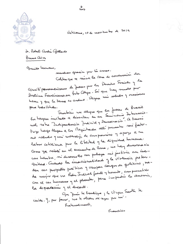 La carta, escrita de puño y letra, ha sido dirigida vía correo electrónico por Bergoglio a un viejo conocido, el juez argentino Andrés Gallardo. A él lo llama «querido hermano» y transmite en el primer párrafo felicitaciones por el encuentro de la mesa de conducción del Comité Panamericano de Juezas y Jueces por los Derechos Sociales y Doctrina Franciscana, a quienes recibió y dirigió un discurso a principios de junio en la Academia de Ciencias y Ciencias Sociales en el Vaticano.