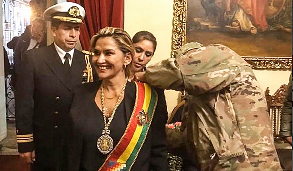 Otra golpista autoproclamada que se agrega al descolorido Juan Guaidó en Venezuela. Éste era presidente de la Asamblea Nacional cuando se trepó a una improvisada tarima callejera para hacerlo.La señora Añez sólo alcanzó a ser una segunda vicepresidenta. Pero es regla cuantitativa para estos golpistas de farsa no superar la barrera de cien mil votos: Guaidó se creyó presidente con 97 492 votos; Añez se lo cree con 91895. Cero y van dos en menos de un año en la atormentada América del Sur. Ambos mandatos, igual de abusivos y hueros.