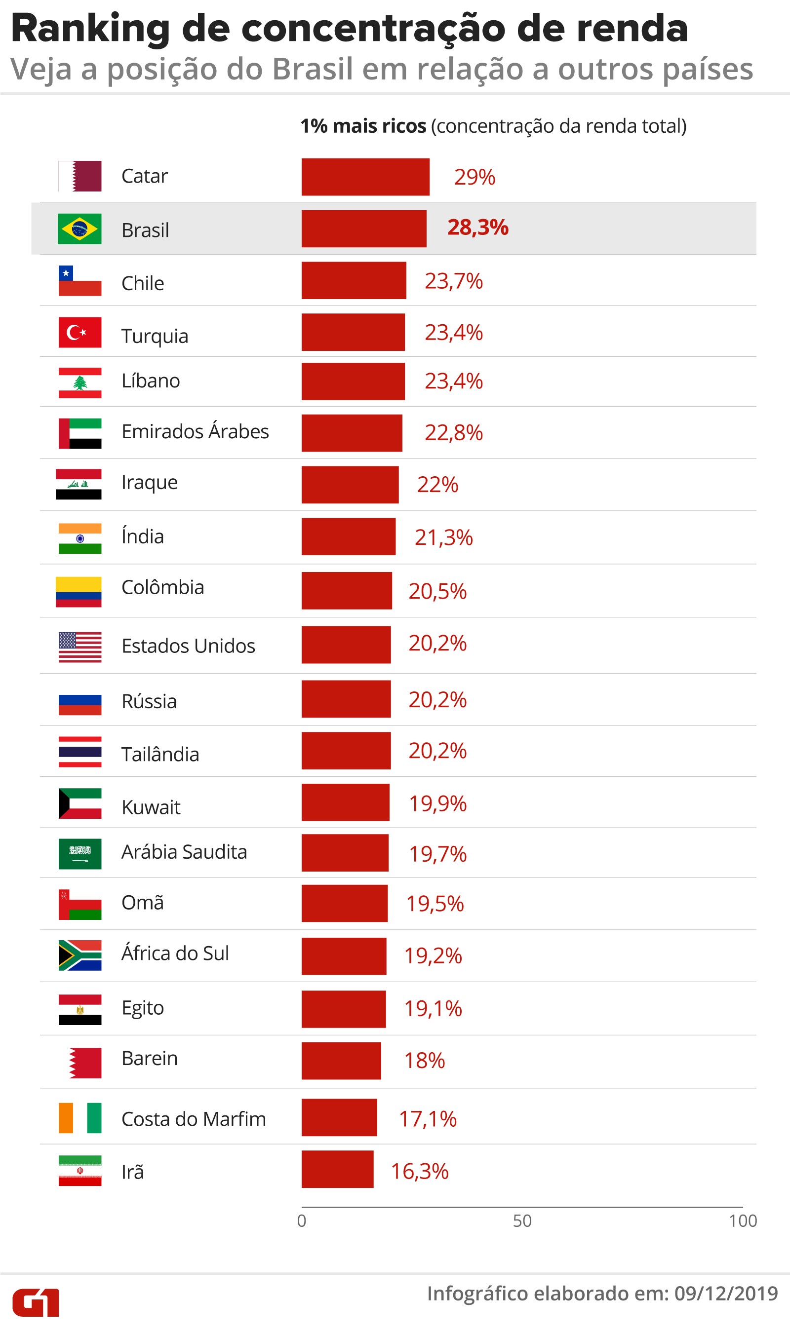 No Brasil, os 1% mais ricos concentram 28,3% da renda total do país (no Catar essa proporção é de 29%). Ou seja, quase um terço da renda está nas mãos dos mais ricos. Já os 10% mais ricos no Brasil concentram 41,9% da renda total.