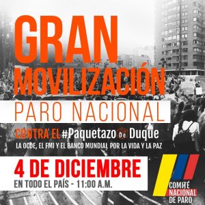 “Estamos dispuestos y dispuestas a sentarnos en una mesa de negociación con el Gobierno Nacional, que se entiende como un proceso aparte e independiente de la conversación nacional que ha citado el Gobierno con demás sectores y que por supuesto, está en todo el derecho de hacerlo. Llamamos a la población colombiana a la gran movilización del 4 de diciembre contra el ‘paquetazo’, la defensa de la vida y la necesidad de paz para nuestro país”, recalcó Pedraza.