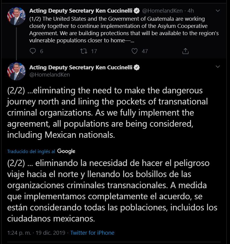“A medida que implementamos completamente el acuerdo, se están considerando todas las poblaciones, incluidos los ciudadanos mexicanos”, dijo Cuccinelli en su cuenta de Twitter, dejando la posibilidad en que Guatemala acoja a personas de varios países, no solo a los que estaban establecidos desde un inicio.