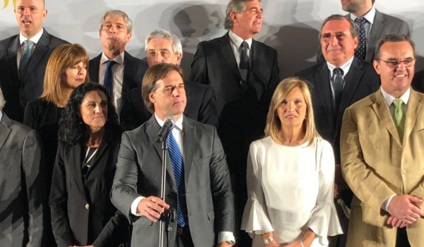 Se hizo acompañar por todos los integrantes de su gabinete, pero destacaron a su izquierda la vicepresidenta electa, Beatriz Argimón, y a su derecha la futura ministra de Economía, Azucena Arbeleche.