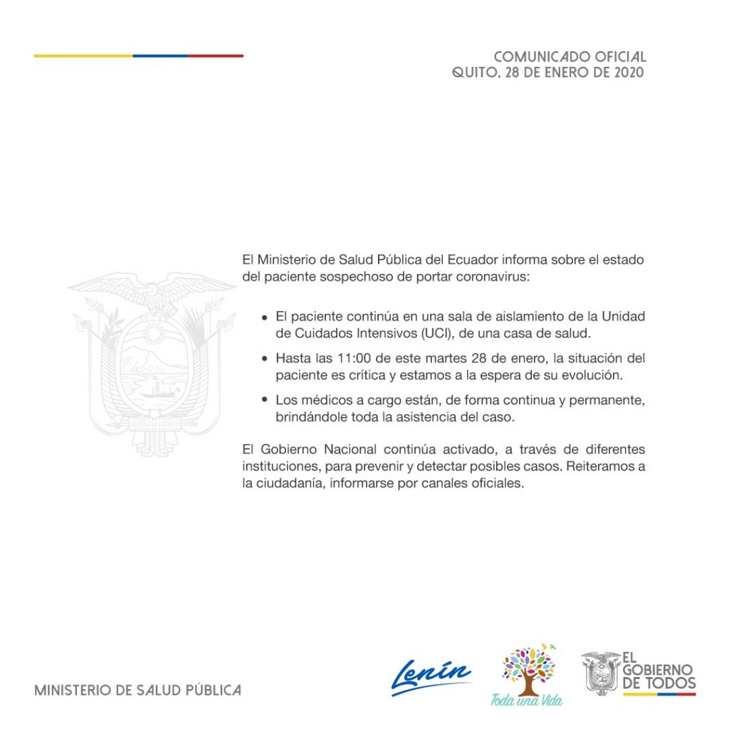 Ecuador | Comunicado del gobierno respecto a posible caso de virus
