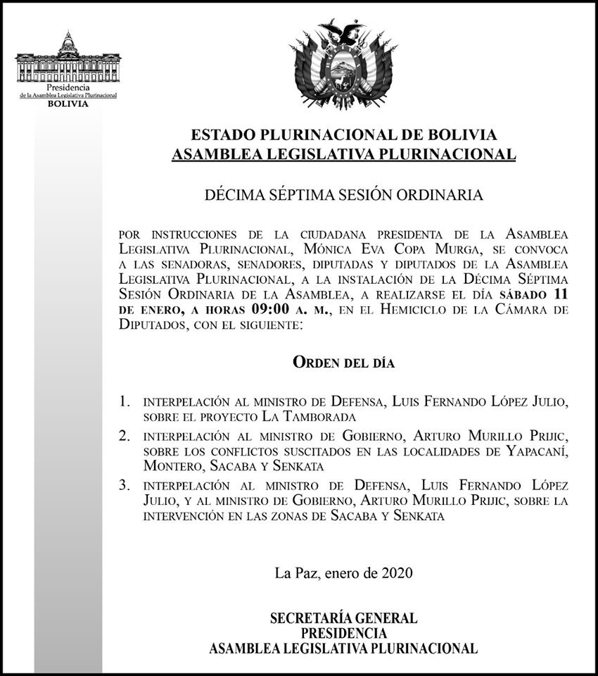 Según la convocatoria, instruída por la presidenta de la ALP, Eva Copa, la sesión interpelará primero al Ministro de Defensa sobre el proyecto de La Tamborada.