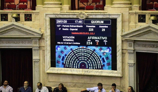 La Cámara de Diputados le dio media sanción y un respaldo abrumador al proyecto que faculta al Gobierno a renegociar la deuda en dólares con los acreedores privados bajo jurisdicción extranjera. Con 224 votos a favor, 2 en contra y 1 abstención se dio media sanción a la Ley de Restauración de Sustentabilidad de la Deuda Pública emitida bajo ley extranjera”, según la nueva denominación del proyecto aceptada por el oficialismo para ceñir los términos de la negociación que estará a cargo del Ejecutivo.