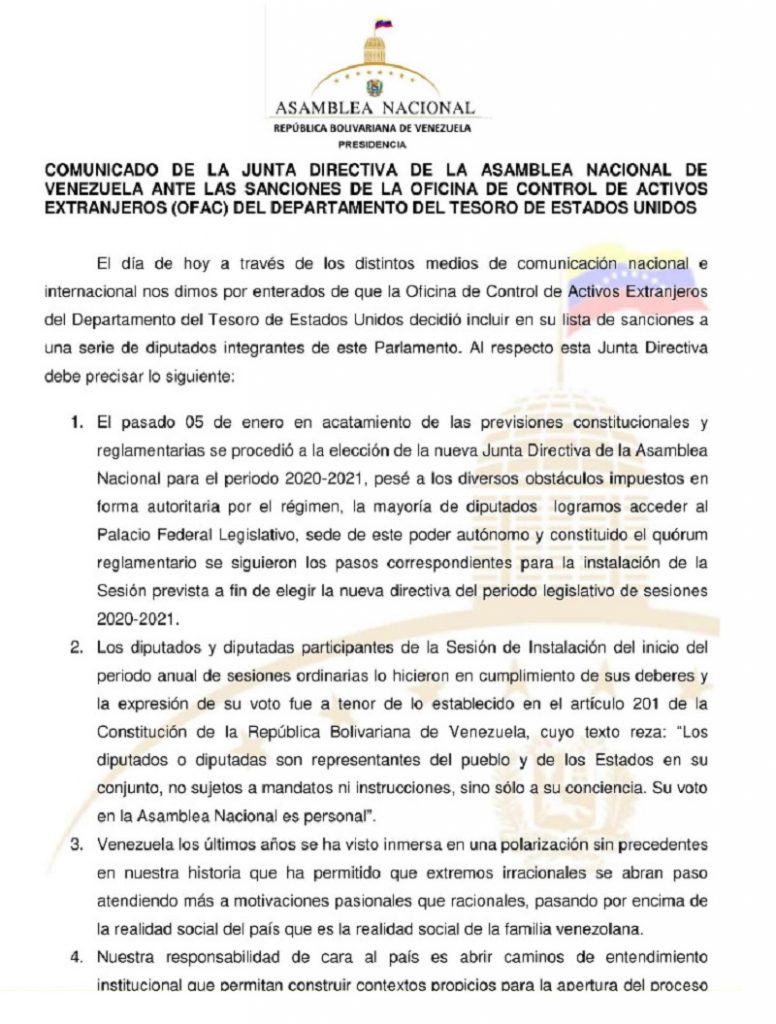 “Estas acciones unilaterales en nada contribuyen a generar contextos de entendimiento que pongan al ciudadano en el centro de la agenda para atender sus urgencias”, explica el comunicado de seis puntos publicado por la AN.