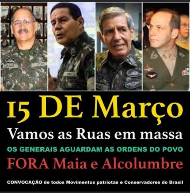 La convocatoria del 15 de marzo, bajo el slogan “Brasil es nuestro y no de los políticos de siempre”, ya recibió el apoyo de al menos seis legisladores oficialistas. Uno de los flyers de difusión dice “los generales aguardan las órdenes del pueblo” junto a las fotos de cuatro generales-funcionarios como el vicepresidente Hamilton Mourão.