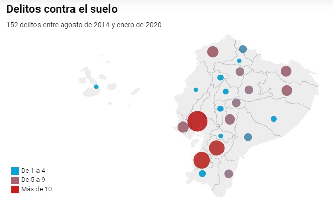 Con relación a las denuncias contra el suelo, que suman 152, Guayas (31), El Oro (20) y Azuay (17) son las que concentran más acusaciones. Las mismas están relacionadas, sobre todo, con la minería ilegal y la agricultura en espacios no destinados a esa actividad.