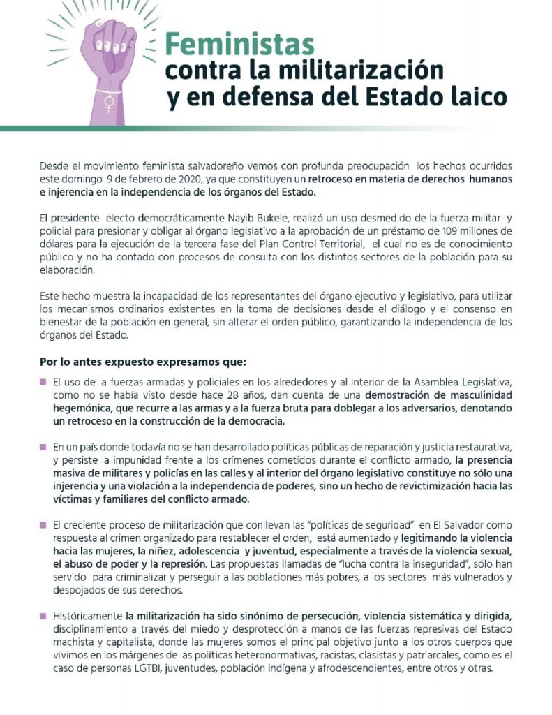 «Esta tarde hemos presentado muchas denuncias sobre la militarización de la Asamblea Legislativa, lo denunciamos ante el mundo y exigimos desmilitarice la Asamblea Legislativa, que es la casa del pueblo», dijo Díaz.