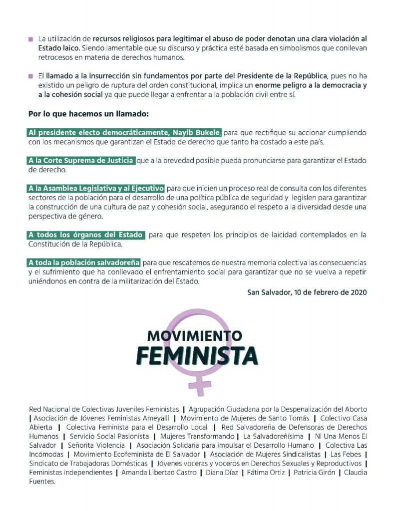 Al mismo tiempo indicaron que: «Exigimos al Presidente Bukele cumplir su función constitucional de procurar la paz y la armonía social; y no utilizar el respaldo popular para “aventuras golpistas” y derivas autoritarias, sino para profundizar la democracia y enfrentar responsablemente los problemas estructurales del país mediante el diálogo, permitiendo la participación ciudadana, respetando la institucionalidad y garantizando el Estado de derecho».