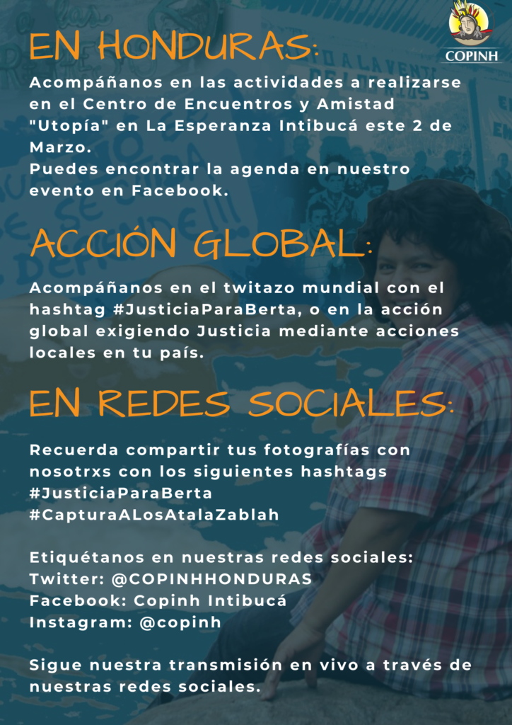 El COPINH se complace en invitarles a conmemorar con nosotras y nosotros el 4to. Aniversario de la siembra de nuestra compañera Berta Cáceres, a realizarse este 2 de marzo.