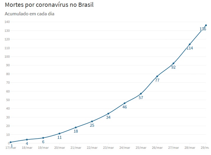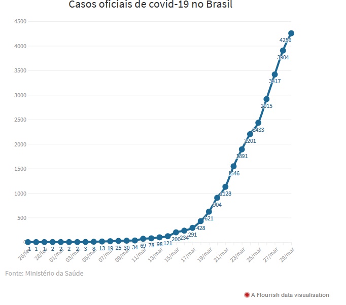 Segundo projeções do ministério da Saúde, se os contatos sociais não forem reduzidos no Brasil, os casos de coronavírus devem duplicar a cada três dias. Segundo dados oficiais, o país tem 3.904 infectados pelo coronavírus e 111 mortos. Mas os números reais são muito maiores, já que muitos infectados não têm sintomas e não há testes para todos.