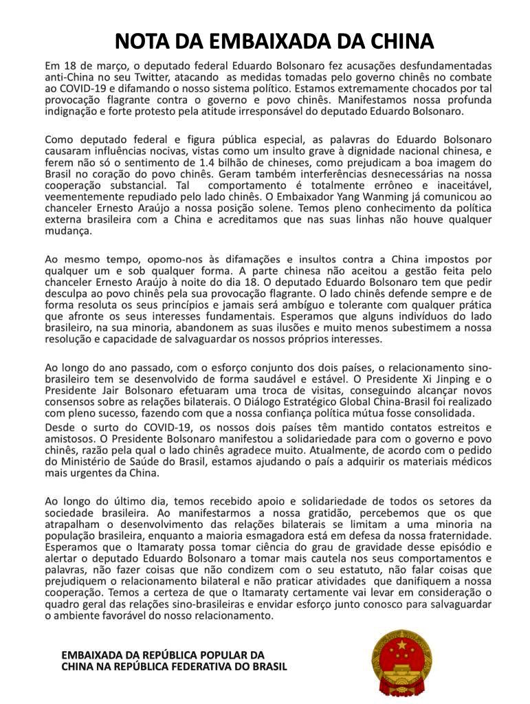 Al conocer la publicación, el embajador de China en Brasil, Yang Wanming, manifestó igualmente en redes sociales el «repudio» y la «indignación» de China por las declaraciones de Eduardo Bolsonaro y exigió disculpas.
