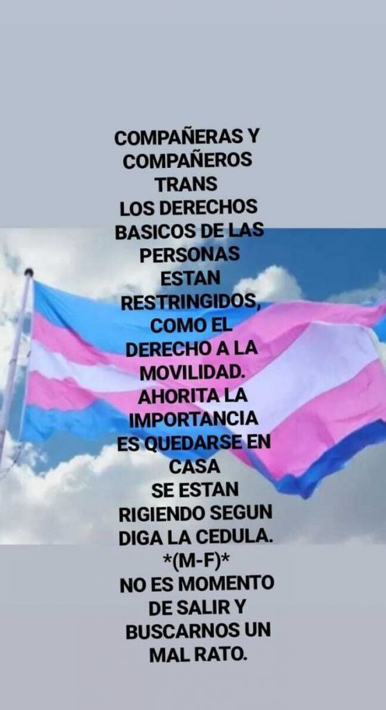 La recomendación que han hecho Tejada y González a otros miembros de la comunidad de personas trans es que permanezcan en sus casas de ser posible y que de ser necesario le pidan a un familiar o conocido que salga a hacer las compras necesarias.