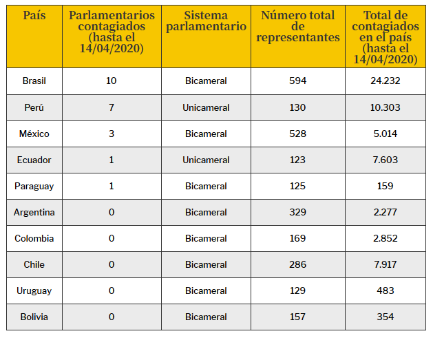El Congreso sumó, este martes 14 de abril, a su séptimo representante contagiado por COVID-19. De esta manera, Perú se convierte en el segundo país con más parlamentarios contagiados de coronavirus en la región, solo por debajo de Brasil.