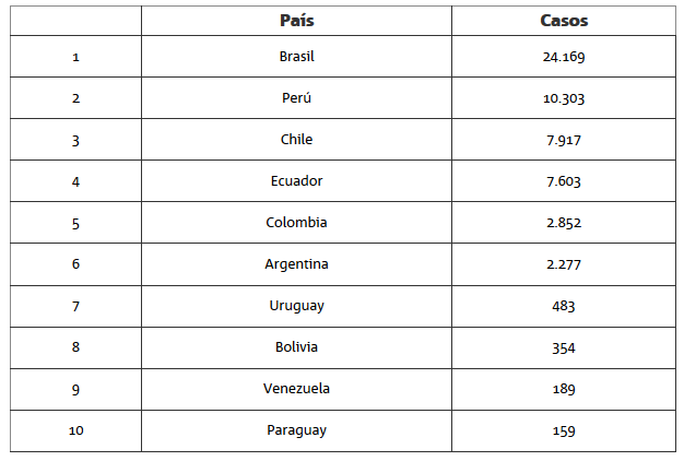 La lista la completan Colombia (2.852 casos y 112 muertos), Argentina (2.277 casos y 102 muertos), Uruguay (483 casos y 8 muertos), Bolivia (354 casos y 28 muertos), Venezuela (189 casos y 9 muertos) y Paraguay (159 casos y 7 muertos).