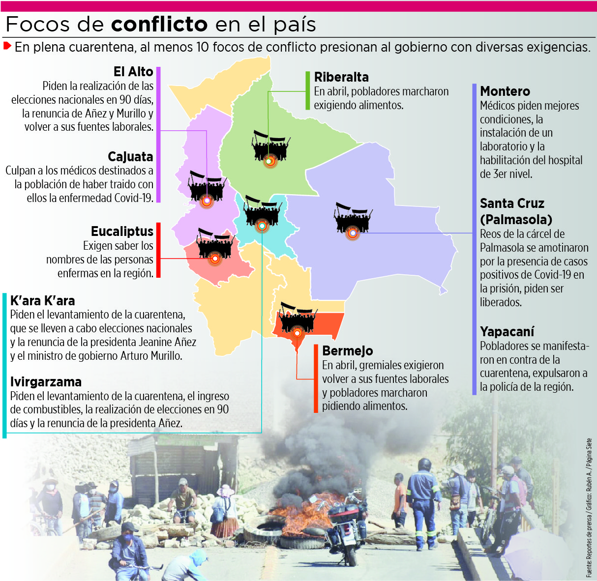 El conflicto en K’ara K’ara, al sur de Cochabamba y al menos otros nueve focos de descontento en cinco departamentos, presionan al Gobierno en plena emergencia sanitaria por el Covid-19. Las demandas de los grupos enfrentados son diversas, desde el levantamiento de la cuarentena, hasta la renuncia de autoridades.
