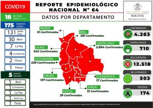 El Ministerio de Salud reportó que Bolivia sumó 175 nuevos casos este lunes y llegó a la cifra total de los 4.263. Cochabamba, en este lunes, solo se anotó cuatro nuevos casos.