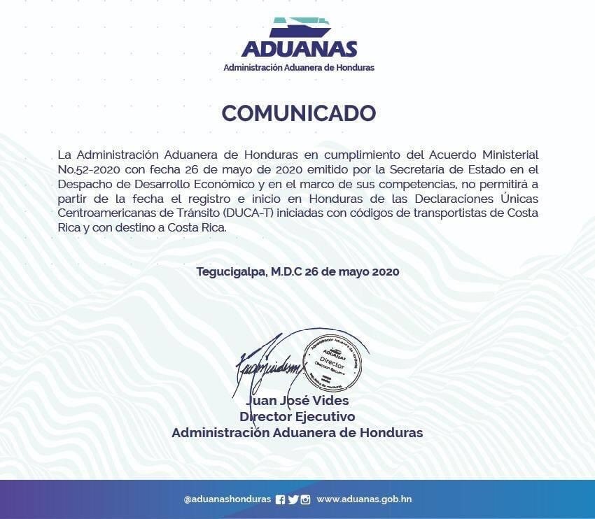 «En cumplimiento del acuerdo Ministerial N•52-2020 con fecha de 26 de mayo de 2020 emitido por la secretaría de Estado en el despacho de Desarrollo Económico y en el marco de sus competencias, no permitirá a partir de la fecha, el registro e inicio en Honduras de la Declaraciones Únicas Centroamericanas de tránsito (DUCA-T) iniciadas con códigos de transportistas de Costa Rica», indicó el comunicado emitido por la Administración Aduanera de Honduras.