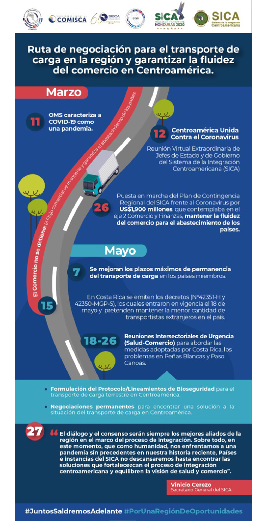 En esa línea de continuar con el diálogo, el consenso y el trabajo articulado, el pasado 24 de mayo la Secretaría General del SICA hizo un llamado a apostarle a un abordaje intersectorial y en la creación de soluciones conjuntas entre todos los países miembros, que permitan asegurar el flujo comercial en Centroamérica.