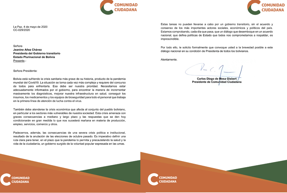 «Es imperativo definir una ruta clara para tener, en el plazo que la pandemia lo permita y precautelando la salud y la vida de la ciudadanía, un gobierno surgido de la voluntad popular expresada en las urnas», escribió a nombre de Comunidad Ciudadana (CC) en una carta a la presidenta Jeanine Áñez.