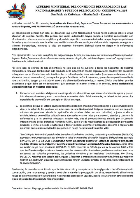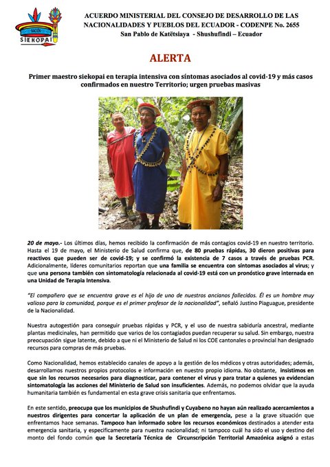 "Hay un total abandono del estado en los territorios de las nacionalidades, si hay muertes por coronavirus en nuestros territorios, será de absoluta responsabilidad del gobeirno nacioanl", marlon vargas presidente de la confeniae@CONAIE_Ecuador @CIDH @coicaorg pic.twitter.com/gkOFpBrFmH