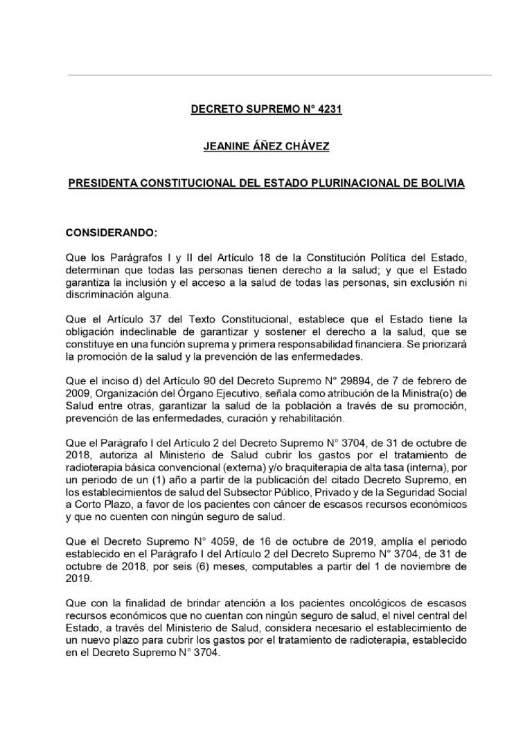 La norma modificatoria se ampara en la declaratoria de emergencia sanitaria y cuarentena nacional para prevenir el contagio y la propagación del coronavirus en Bolivia y cita el artículo 18 de la Constitución Política del Estado que dice que todas las personas tienen derecho a la salud.