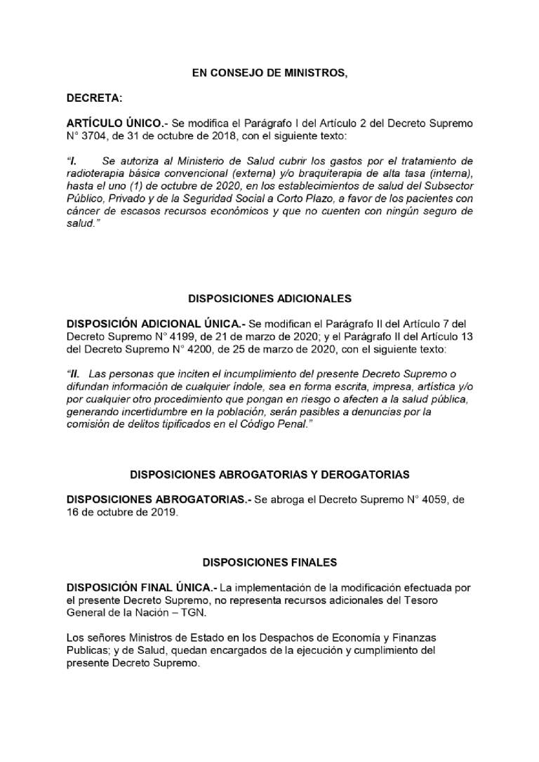 II. Las personas que inciten el incumplimiento del presente Decreto Supremo o difundan información de cualquier índole, sea en forma escrita, impresa, artística y/o por cualquier otro procedimiento que pongan en riesgo o afecten a la salud pública, generando incertidumbre en la población, serán pasibles a denuncias por la comisión de delitos tipificados en el Código Penal”, se lee en el texto.