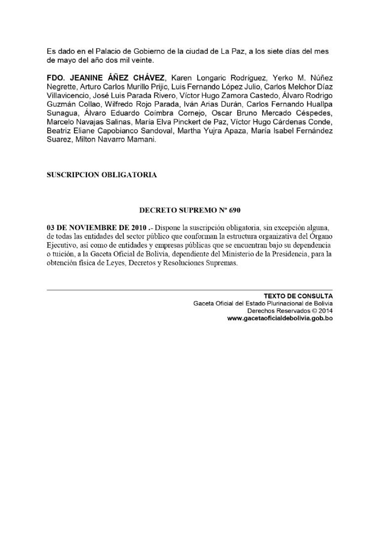 «Se modifican el Parágrafo II del Artículo 7 del Decreto Supremo N° 4199, de 21 de marzo de 2020; y el Parágrafo II del Artículo 13 del Decreto Supremo N° 4200, de 25 de marzo de 2020, con el siguiente texto: