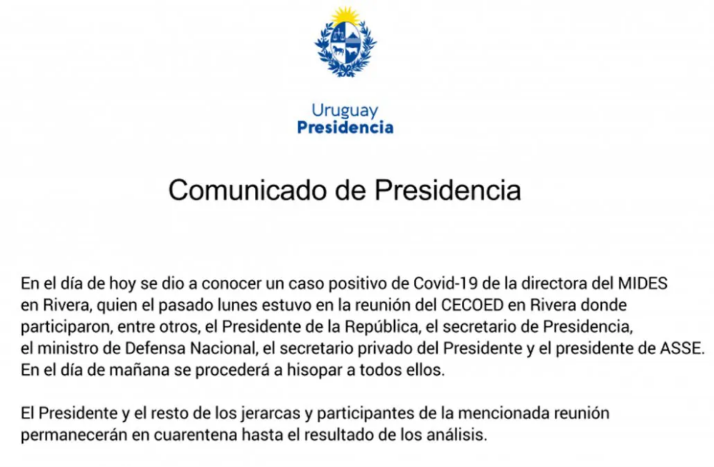 Presidencia informó que todos ellos también se harán el test de Covid-19 en las próximas horas. Mientras esperan el resultado, el presidente y los demás jerarcas del gobierno permanecerán en aislamiento.