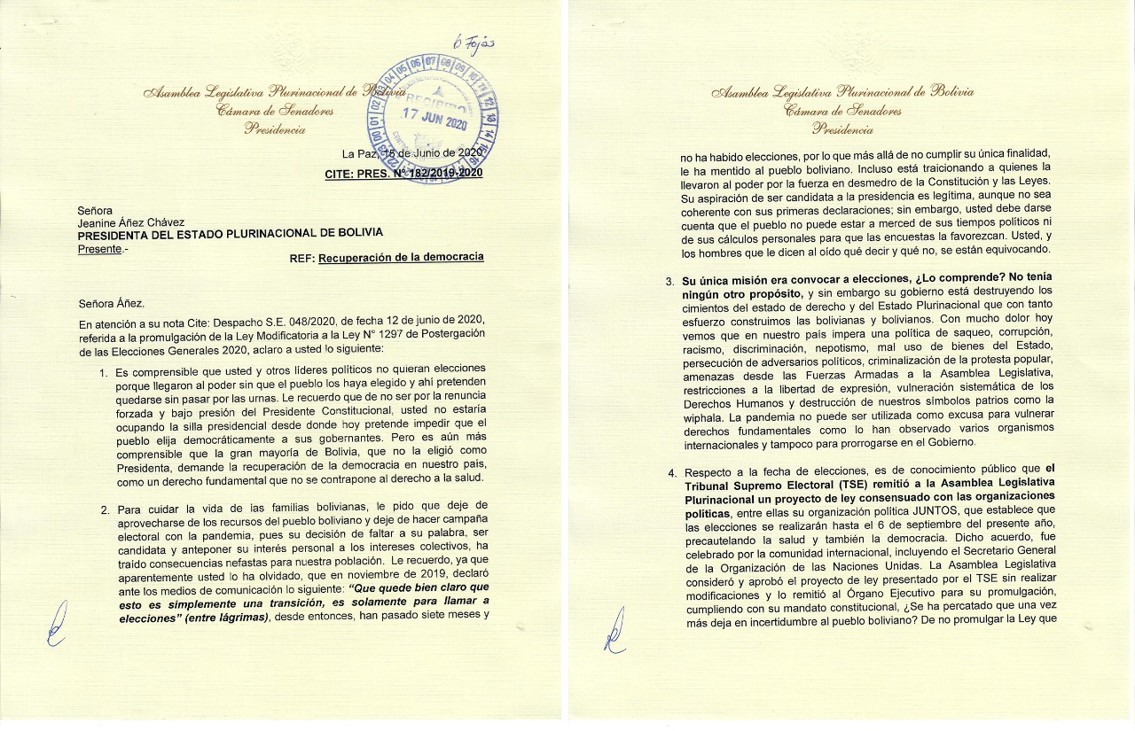 La ley de elecciones fue sancionada por el Senado el 9 de junio, Áñez dijo que la iba a sancionar pero después pidió a la presidenta de la Cámara Alta, Eva Copa, el informe médico y epidemiológico que se utilizó para fijar la fecha de las elecciones generales el 6 de septiembre.