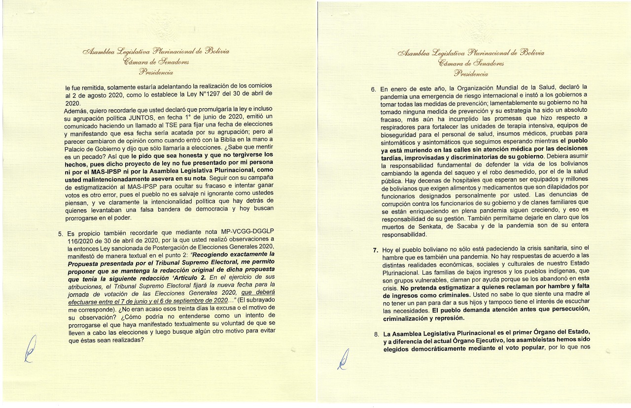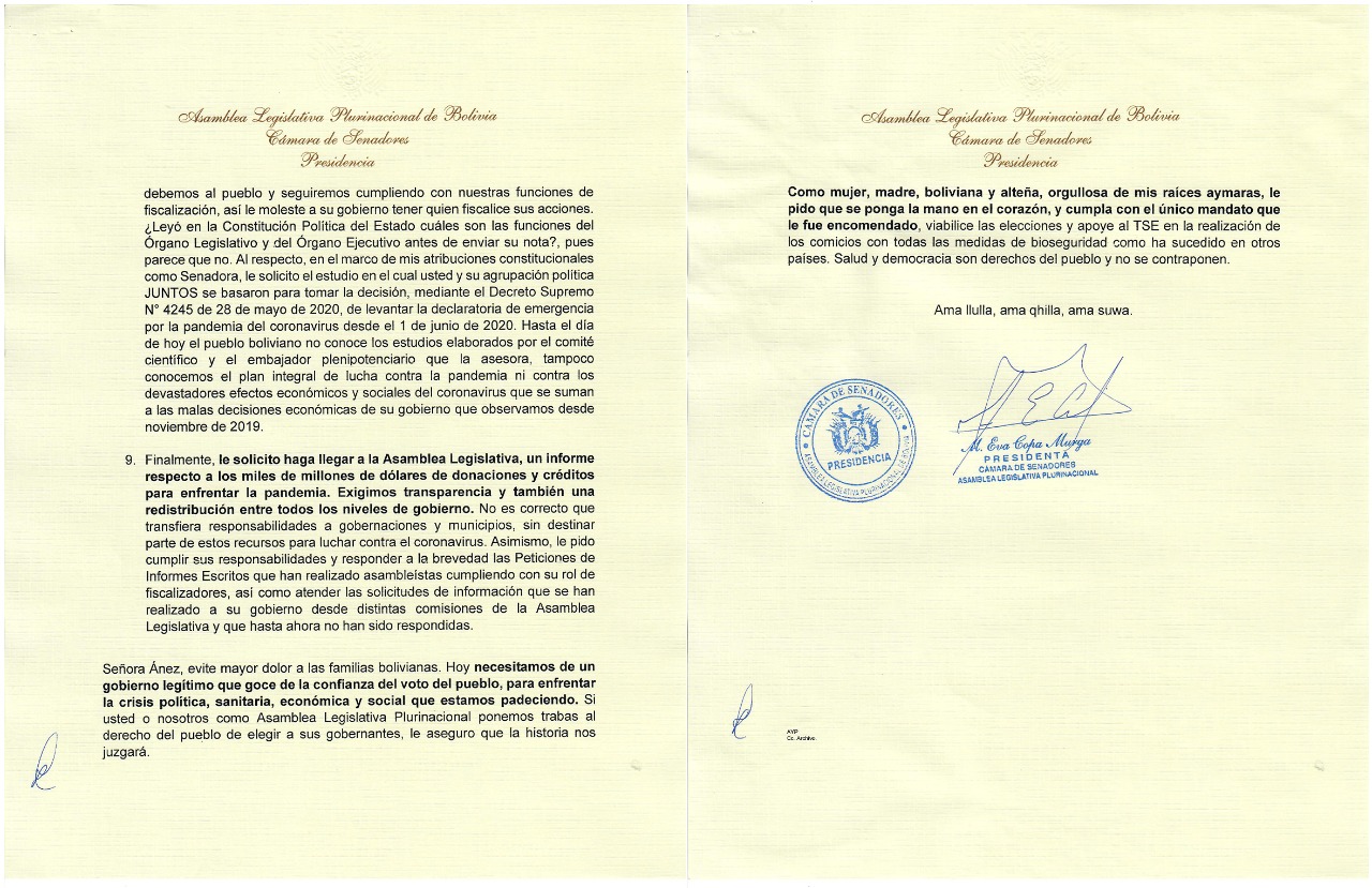 “Le pido que se ponga la mano en el corazón y cumpla con el único mandato que le fue encomendado, viabilice las elecciones y apoye al TSE en la realización de los comicios con todas las medidas de bioseguridad”, invoca en su comunicación la titular de la Cámara Alta.