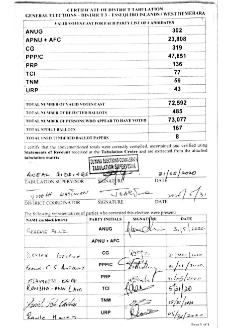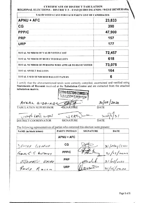Following are the Certificates of Tabulation for the General and Regional Elections for District 3 – Essequibo Islands/West Demerara.