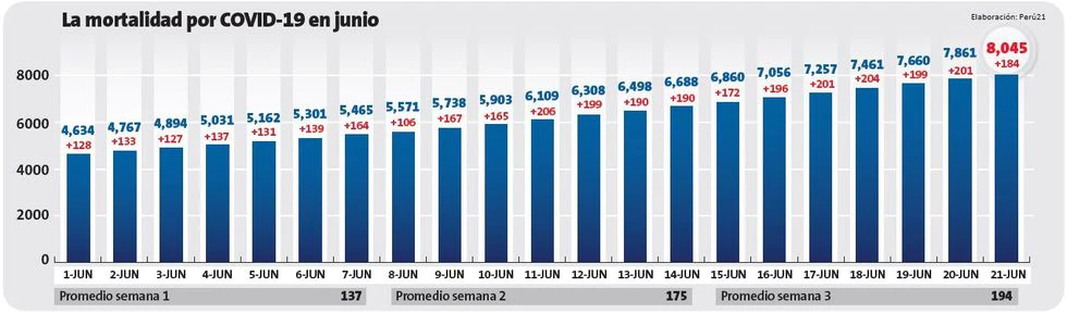Junio inició con 4,634 fallecidos y, ahora, 21 días después, el trágico número es de 8,045. En solo tres semanas, los decesos registrados oficialmente por el Ministerio de Salud (Minsa) aumentaron 3,411.
