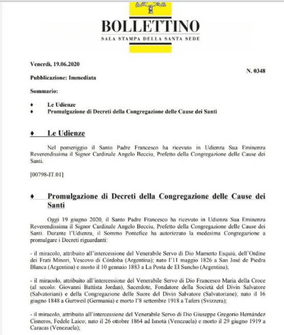 La publicación sostiene que los Decretos promulgados este viernes por la Congregación para las Causas de los Santos con la autorización del Papa Francisco, llevarán a la beatificación a tres Venerables Siervos de Dios que vivieron en el siglo XIX, por el reconocimiento de un milagro atribuido a su intercesión. Entre ellos, se encuentra el médico venezolano José Gregorio Hernández, quien es venerado tanto en el país como en otras latitudes del mundo.