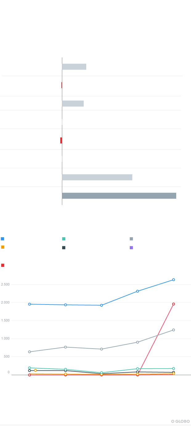 Um dos aumentos mais expressivos ocorreu entre militares que passaram a ocupar cargos comissionados. Eram 1.965 em 2016, número que foi caindo até 2018, para 1.934. Já no primeiro ano do governo Bolsonaro, a quantidade subiu para 2.324, um aumento de 20%. Neste ano, são 2.643 militares ocupando esses cargos, ou 34,5% a mais.