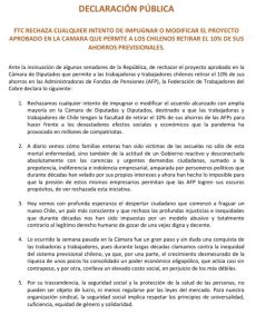 Por esto, “rechazamos cualquier intento de impugnar o modificar el acuerdo alcanzado con amplía mayoría en la Cámara de Diputadas y Diputados, destinado a que las trabajadoras y trabajadores de Chile tengan la facultad de retirar el 10% de sus ahorros de AFP”.