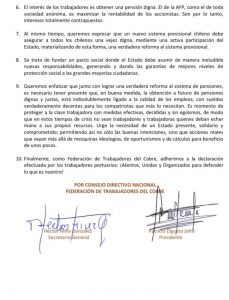 “Por su trascendencia, la seguridad social y la protección de la salud de las personas, no pueden ser objeto de lucro, ni menos regularse por las leyes del mercado. Para nuestra organización sindical, la seguridad social implica respetar los principios de universalidad, suficiencia, equidad de género y solidaridad”, sentencian los trabajadores del cobre, llamando a la creación de un nuevo sistema previsional.