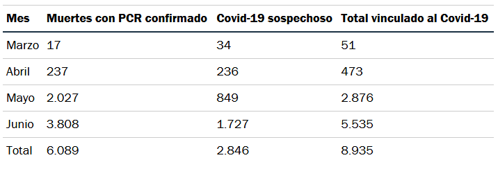 De esta manera, los fallecimientos ligados a la pandemia entre el 1 y 25 de junio ya superaron prácticamente por el doble (exactamente 1,924 veces) lo registrado en todo mayo pasado, cuando murieron 2.876 personas por causas atribuibles a la pandemia (de ellos, 2.027 son víctimas fatales confirmadas con PCR y 849 fueron sospechosas).