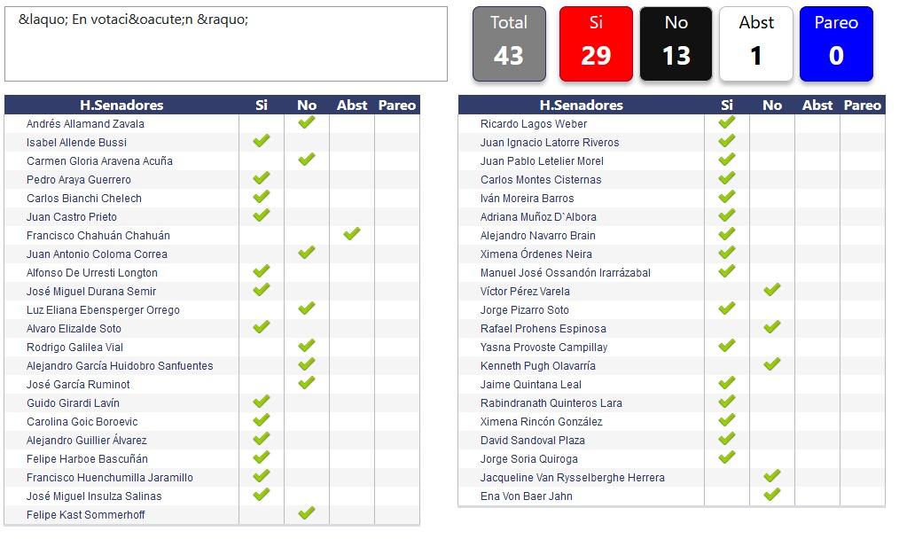 Pese a los alegatos de constitucionalidad de diferentes congresistas de la derecha y del propio ministro del Interior, Gonzalo Blumel, quien se encontraba presente en la sesión, el proyecto fue aprobado por 29 votos a favor, 13 votos en contra y una abstención.