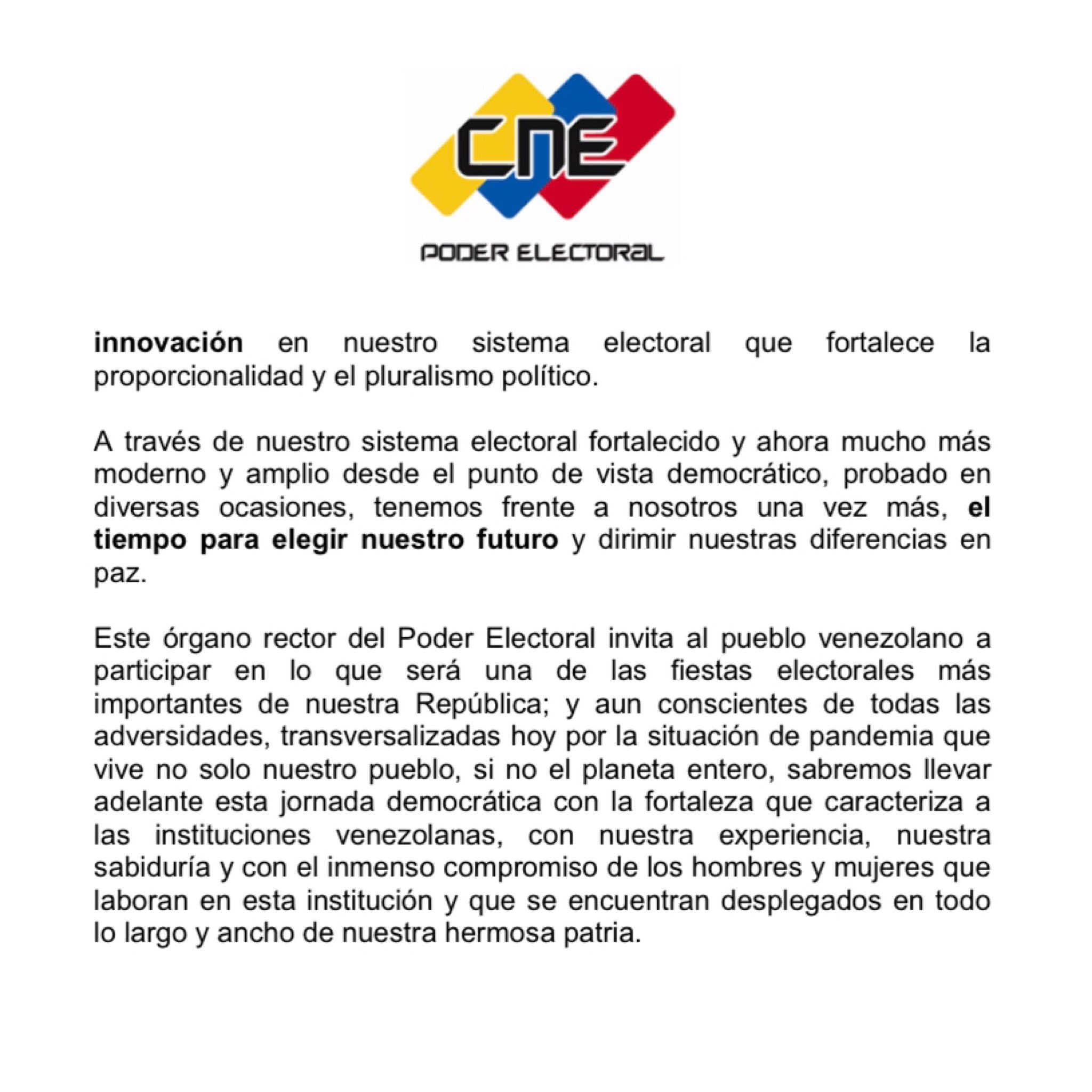 Destacó además que más de 70 organizaciones políticas nacionales y regionales hicieron la presentación física de sus propuestas para las próximas elecciones parlamentarias ante el CNE. Añadió a su vez la rectora que «la nueva junta directiva del Poder Electoral evalúa dichas presentaciones para su eventual incorporación en el proceso comicial», que se prevé desarrollar en diciembre.