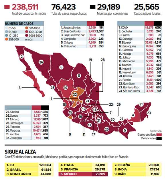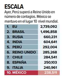 Cifra con la que el país se mantiene dentro de las 10 naciones que en el mundo reportan el mayor número de personas infectadas, de acuerdo con la Universidad Johns Hopkins. Al momento existen, 24 mil 565 casos activos y el número de muertes es de 29 mil 189, tras el reporte de 679 defunciones en un día.