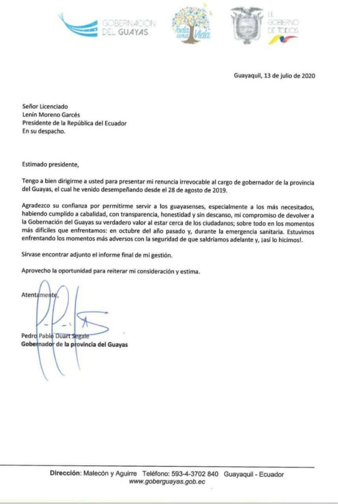 Esta mañana de lunes 13 de julio, Pedro Pablo Duart Segale presentó su renuncia al cargo de gobernador del Guayas.