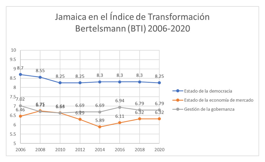Desde 2006 hasta comienzos de 2019, años que abarcan los análisis del Índice de Transformación Bertelsmann (BTI por sus siglas en inglés), Jamaica evidencia ser uno de los países con menos transformaciones, tanto en la dimensión política como la económica y de gobernanza, en todo América Central y el Caribe. El país presenta una ligera tendencia a la baja en las primeras dos de las mencionadas y en la tercera conserva la mayor estabilidad. El próximo 3 de septiembre, se celebrarán elecciones generales, que legalmente estaban estipuladas para el año que viene, pero fueron adelantadas.