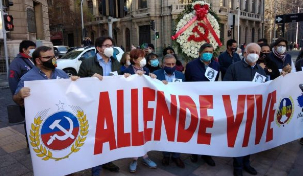 Con fotos de detenidos desaparecidos prendidas de sus pechos y transportando un lienzo con la frase “Allende vive”, dirigentes y parlamentarios comunistas entre los que se contaban Carmen Hertz, Lautaro Carmona, Guillermo Tellier y el alcalde Daniel Jadue, caminaron por Morandé para presentar su ofrenda floral ante la estatua del ex Mandatario.