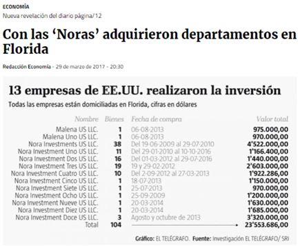 Al listado anterior se suma un entramado de 29 offshore denominadas “Nora” que tienen entre sus propiedades bienes inmuebles que superan los 23 millones de dólares en Florida.
