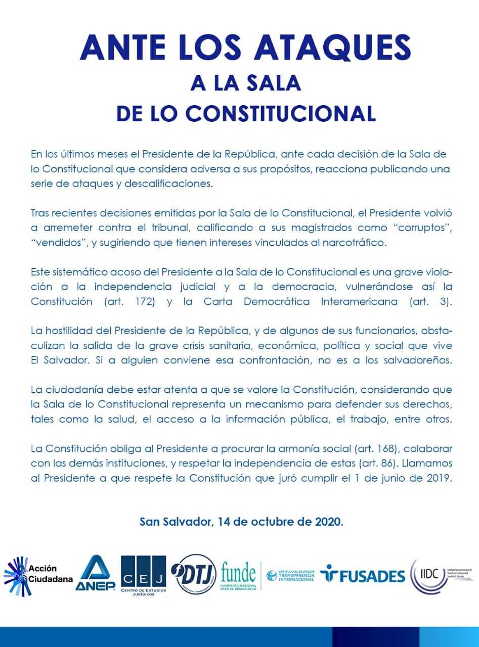 En este sentido, expresaron que ante cada decisión de la Sala de lo Constitucional que considera adversa a sus propósitos, Bukele reacciona publicando una serie de ataques y descalificaciones.