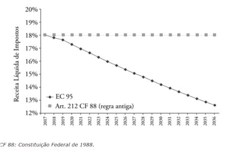 Para ello, ya se deberían haber implementado los mecanismos creados por la Campaña Brasileña por el Derecho a la Educación e incorporados por la Ley del PNE en su meta 20, de financiamiento, el Costo Alumno-Calidad Inicial (CAQi) y el Costo Alumno-Calidad (CAQ) en 2015 y 2017, respectivamente, y representaría un aumento del 7% del PIB para 2019 (a los 5 años de vigencia), y del 10% del PIB para 2024 (al final del Plan). Pero EC 95 impone todo lo contrario de eso cuando congela las inversiones para el área a partir de 2017 y lo que sucederá, de hecho, es lo siguiente: