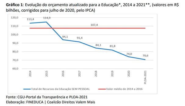 De un presupuesto de R$ 114,9 mil millones (USD 23 mil millones) en 2015, Educación cuenta una previsión presupuestaria para 2021 de R$ 70,6 mil millones (USD 14,12 mil millones), una reducción del 38,6%, provocando un grave retroceso social en el derecho a la educación de la población brasileña.